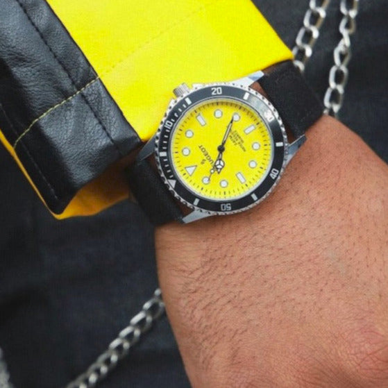 Vibrant and adventurous, The Maverick stands out with its bold 42mm sport bezel, eye-catching yellow dial, and rugged canvas strap. Designed for weekend warriors and urban explorers alike, it brings energy and edge to any look. Whether you're hiking a trail or navigating city streets, this watch keeps you on time and on point. The Maverick is for the man who’s never afraid to stand out.