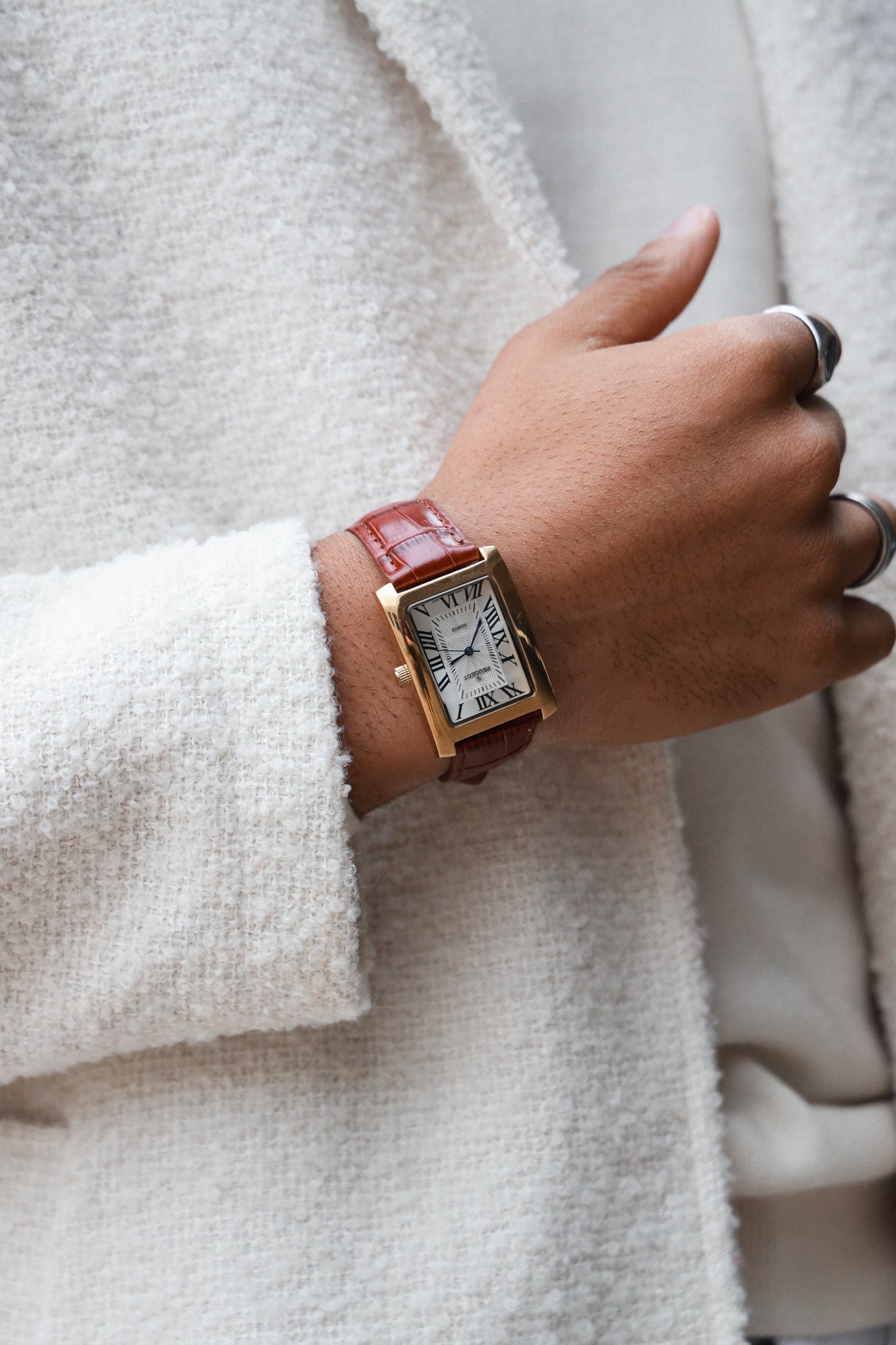 Bold yet refined, The Mercer channels vintage charisma with a modern edge. Featuring a 43x30mm rectangular case and soft leather strap, it’s the kind of watch that turns heads without trying. Whether you're heading to a jazz night downtown or sealing a deal over lunch, this timepiece brings a sense of classic cool to every moment. A statement in minimalism, it’s built for men who appreciate timeless detail.