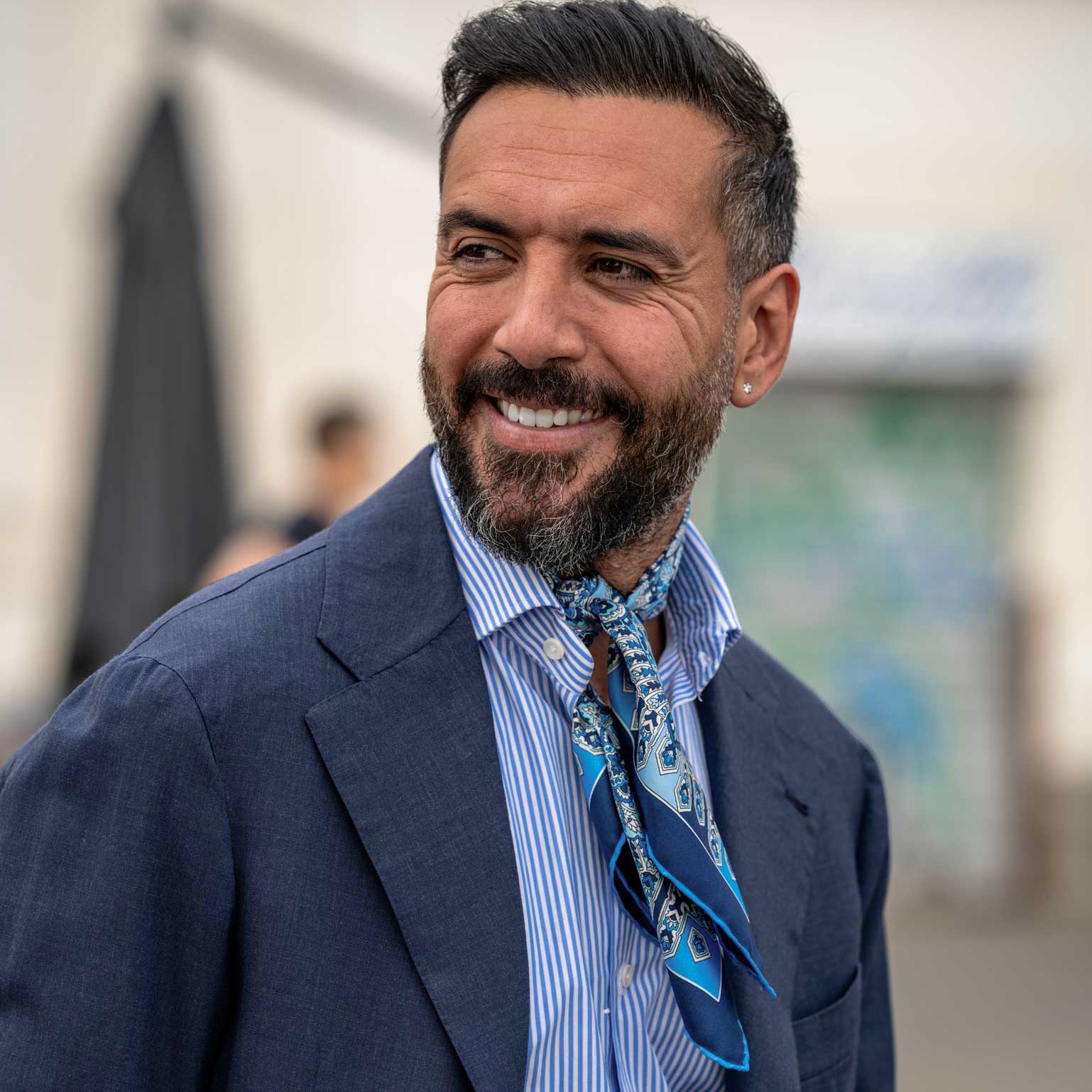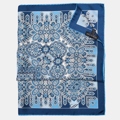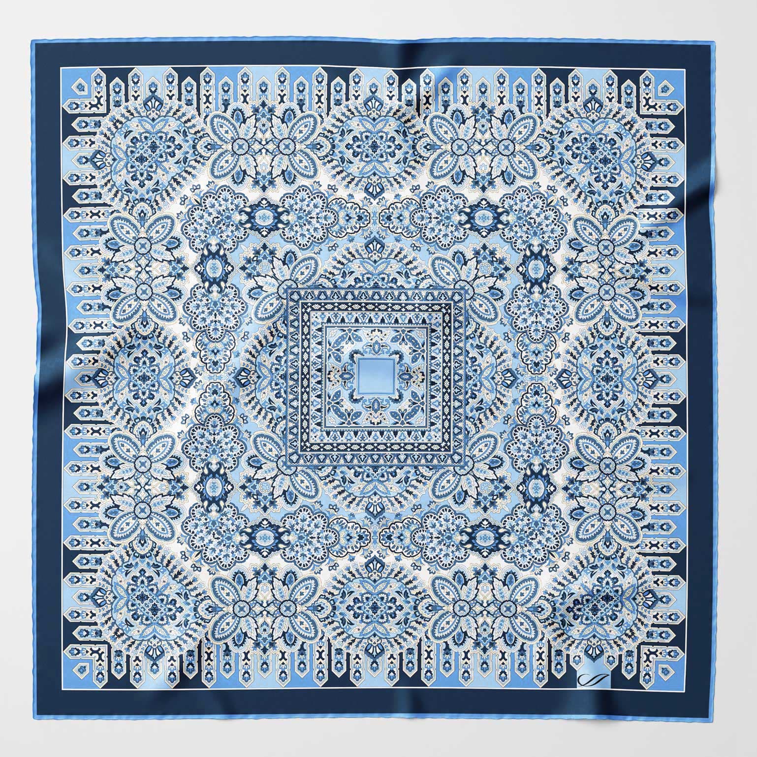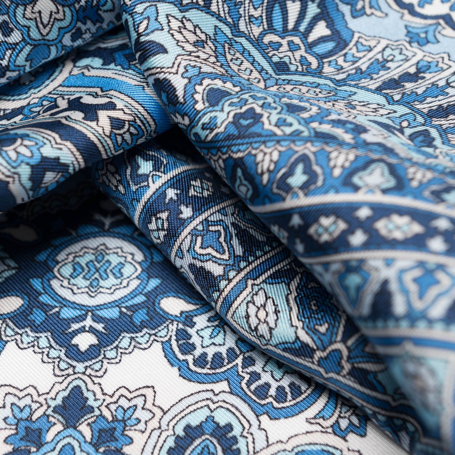 The classic paisley design in shades of blue and white captures the essence of timeless style with a touch of Mediterranean charm, inspired by the coastal beauty of Messina in Sicily.