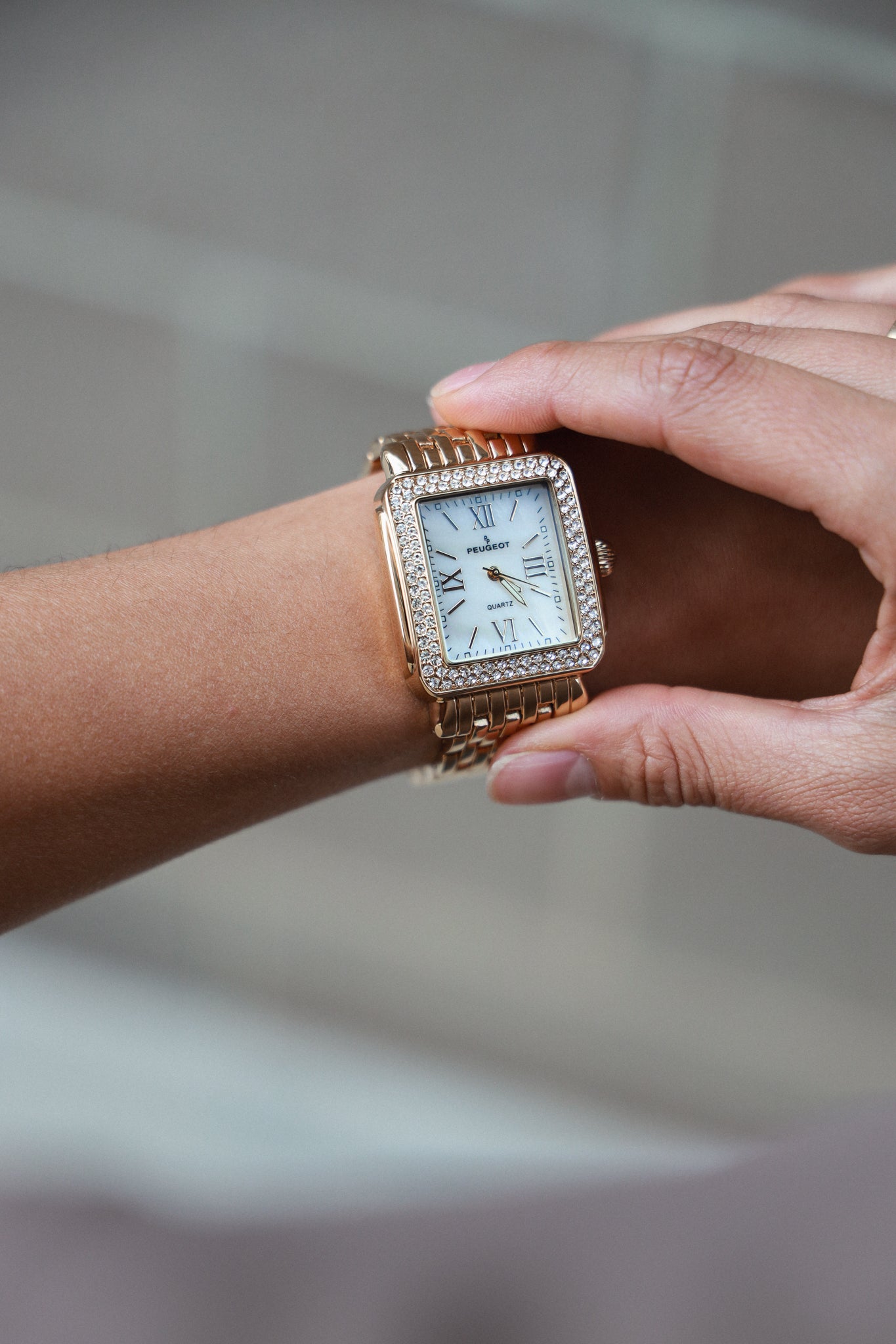 Bold and radiant, the Simone makes a statement with its crystal-lined bezel and luxe gold-tone tank case. The panther link bracelet adds a touch of vintage glamour, giving the watch a rich, jewelry-like presence on the wrist. It’s elegance with an edge—made to shine from day to night.